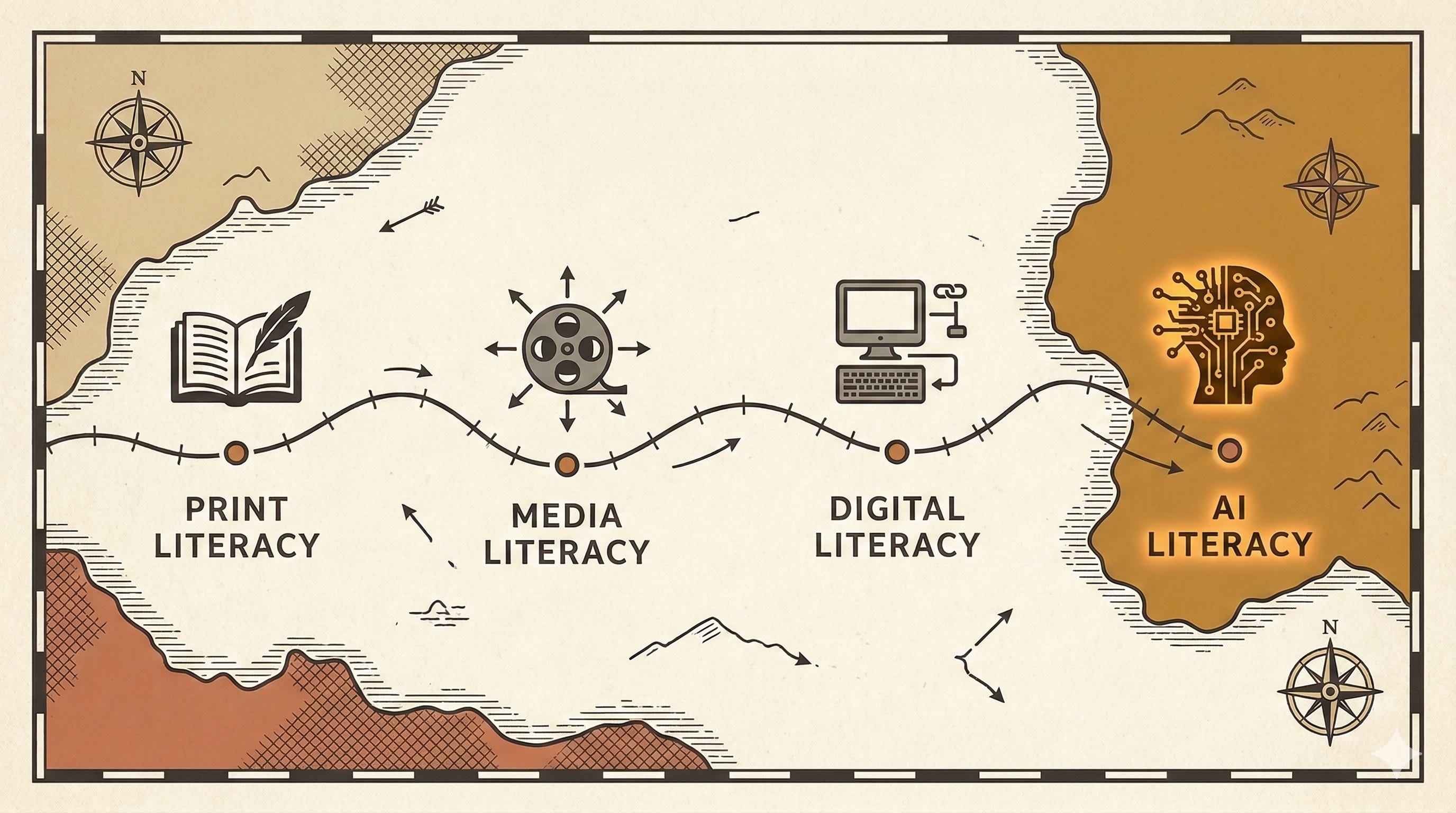 AI literacy follows the same lineage. But the word matters for another reason, too. Training teaches you a tool. Literacy builds a relationship with the whole category of things. We don’t want educators and students who are trained on ChatGPT. We want people who can navigate AI as a class of technology, whatever form it takes next year or in five years. Training expires. Literacy lasts — it maps.