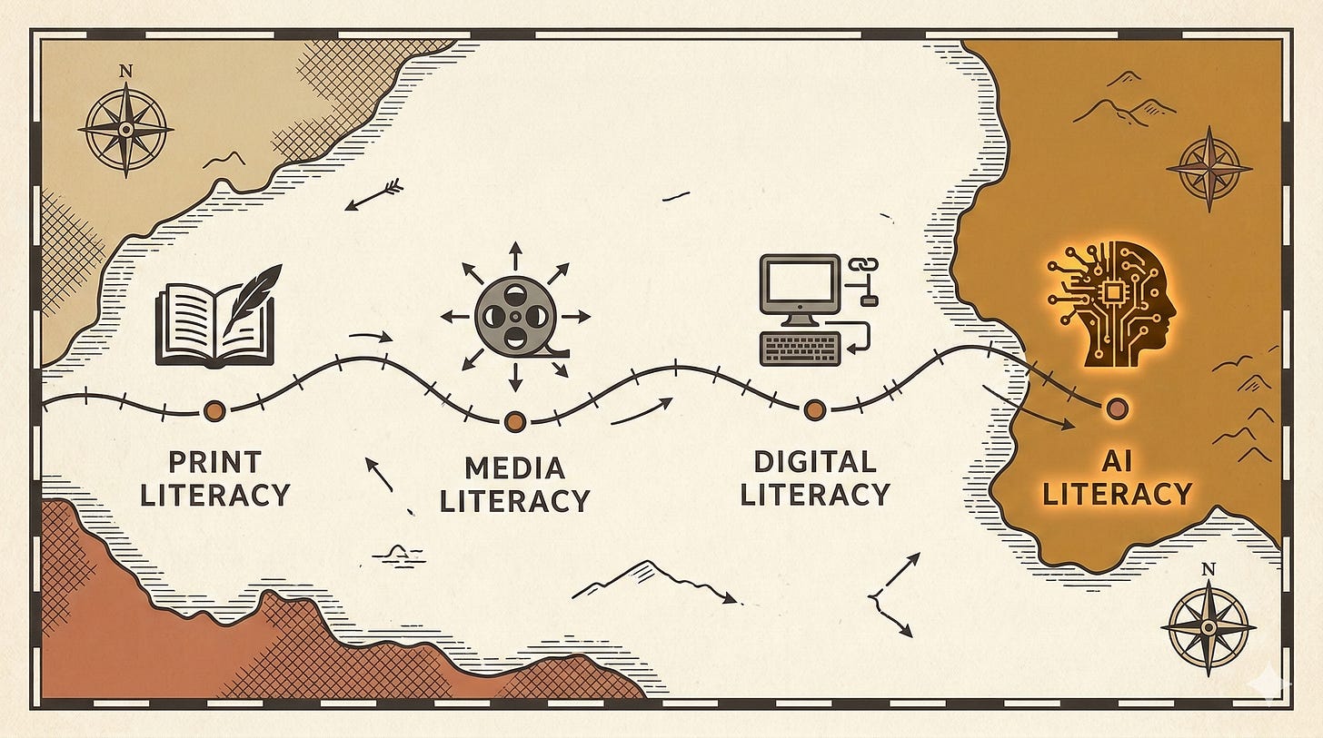 We’ve been here before. Every time a new kind of content entered everyday life, like print, broadcast media, and the internet. We eventually realized that access alone wasn’t enough. You need to read it critically, produce it responsibly, and recognize when it was working on you. That’s how media literacy was born. Information literacy. Digital literacy. Each one was us saying: this thing is too consequential to leave to instinct.