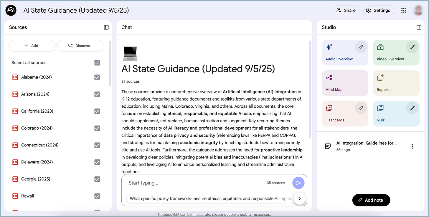It’s called NotebookLM. If you haven’t heard of it, you’re not alone. Our Lab team has recently introduced the tool to teachers in workshops across the Big Sky Country, and a few seem to have heard of it, let alone used it, even among the AI-forward teachers. But if you’re an educator, policymaker, student, or just someone who works with a lot of complex documents, this tool deserves a spot in your daily workflow.