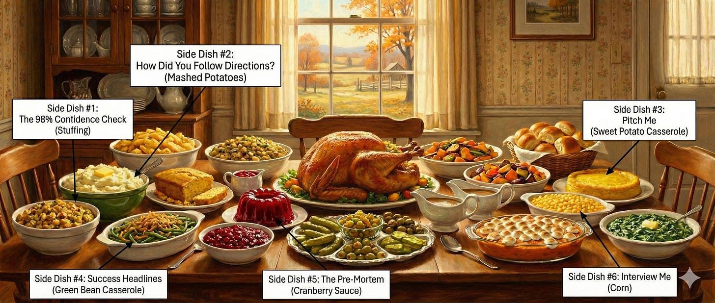 If your main prompt is the turkey on the table, then prompt sides are all the little extras you put around it to make the meal worth showing up for. A side is not a totally new prompt or a giant block of instructions. It’s one or two short sentences you tack on to the end of whatever you were already going to ask the AI to do. Those sentences change how the model thinks about the task: asking for clarification, trying multiple approaches, checking its own work, or writing for a specific audience.